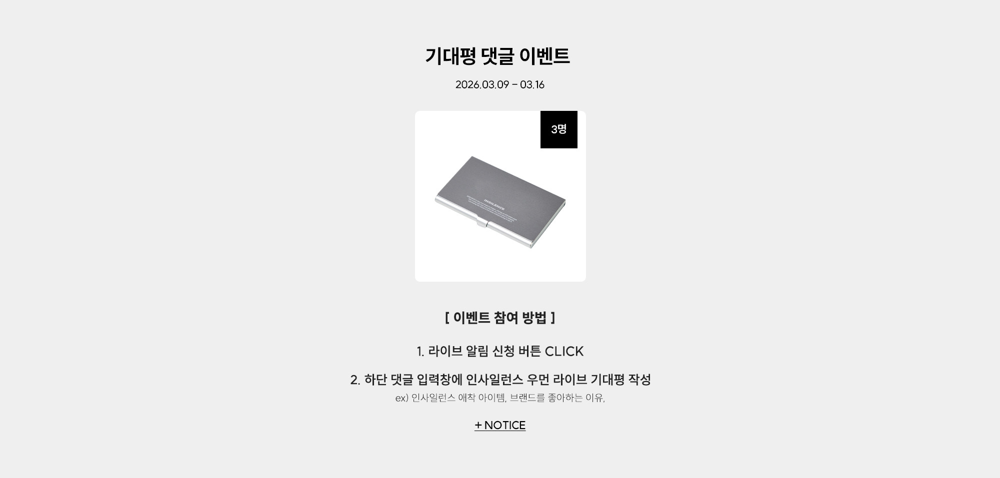 - 해당 이벤트는 3/10 오전 10시 - 3/17 오전 10시까지만 진행됩니다. - 종료 이후 개별 안내 예정입니다. - 당첨 안내 후 2일 이내 연락이 되지 않거나 회신이 없는 경우, 당첨이 자동 취소될 수 있습니다.