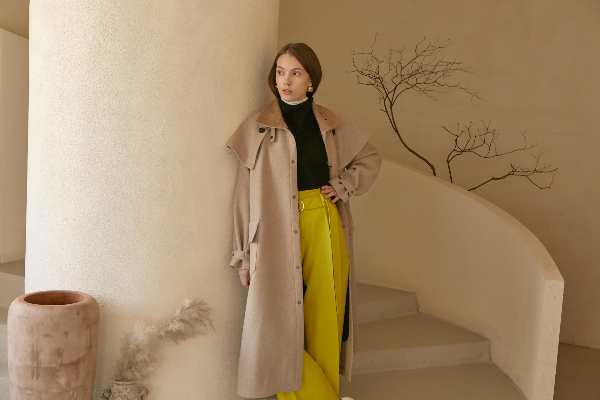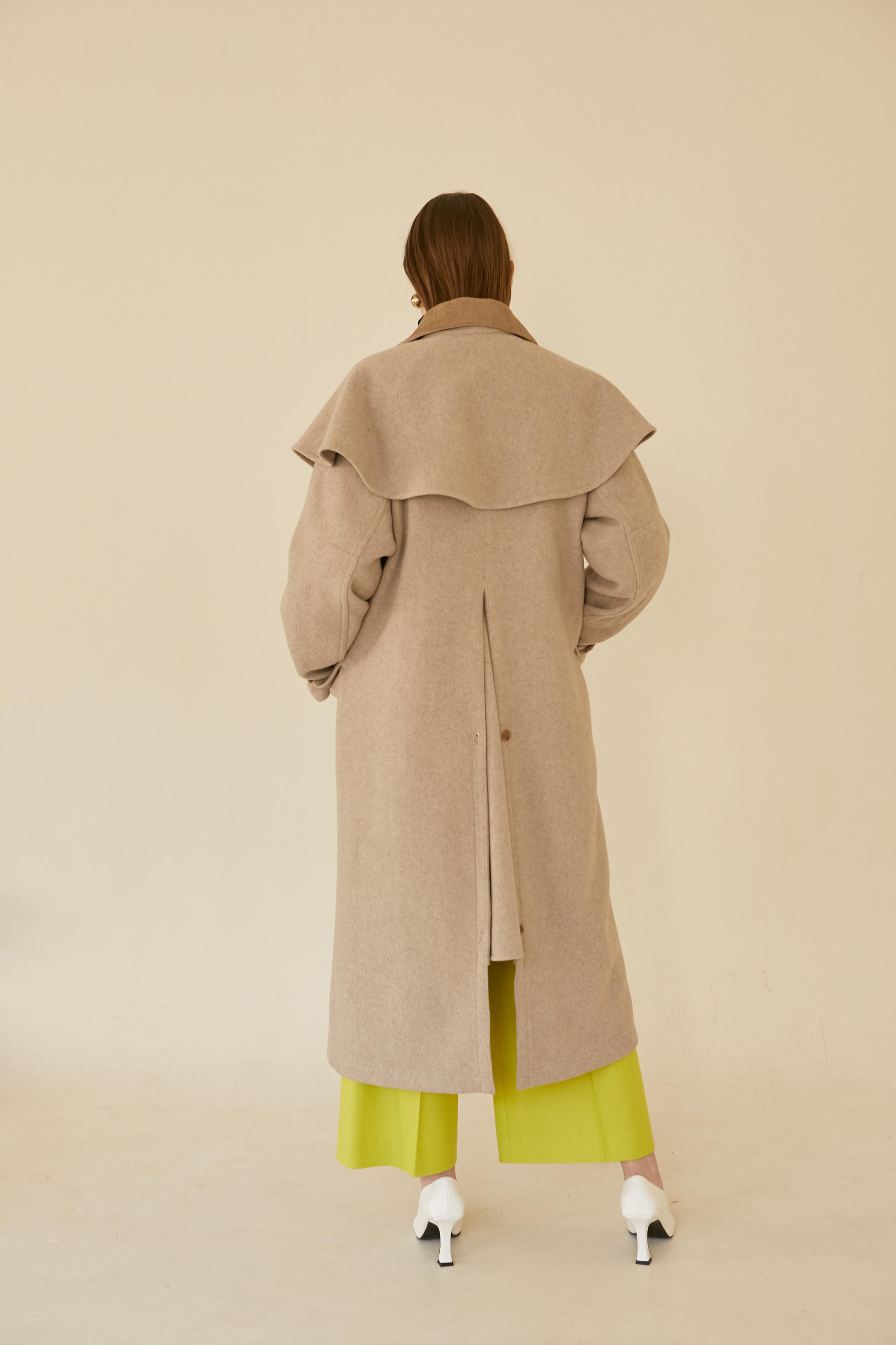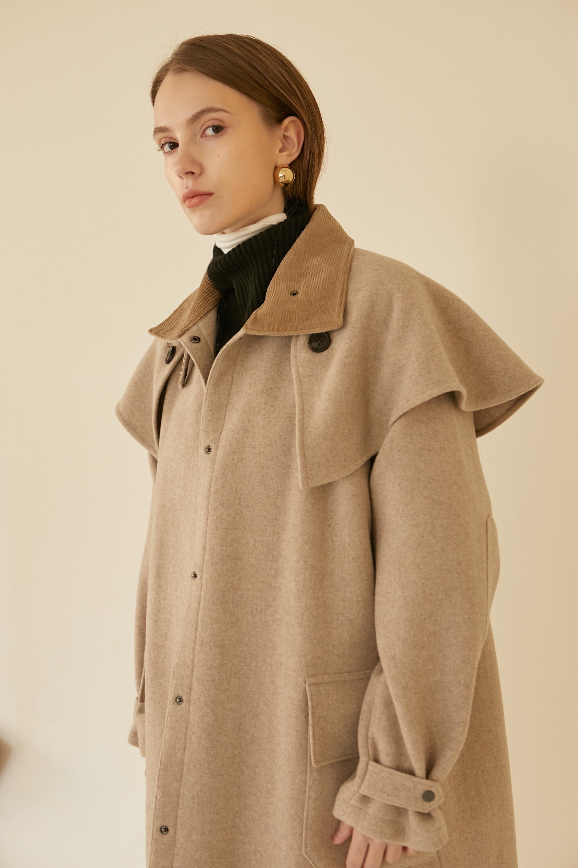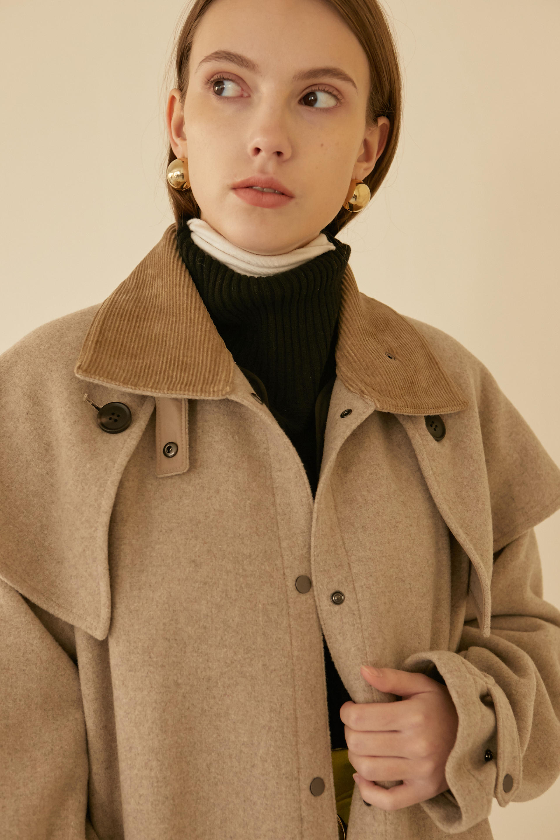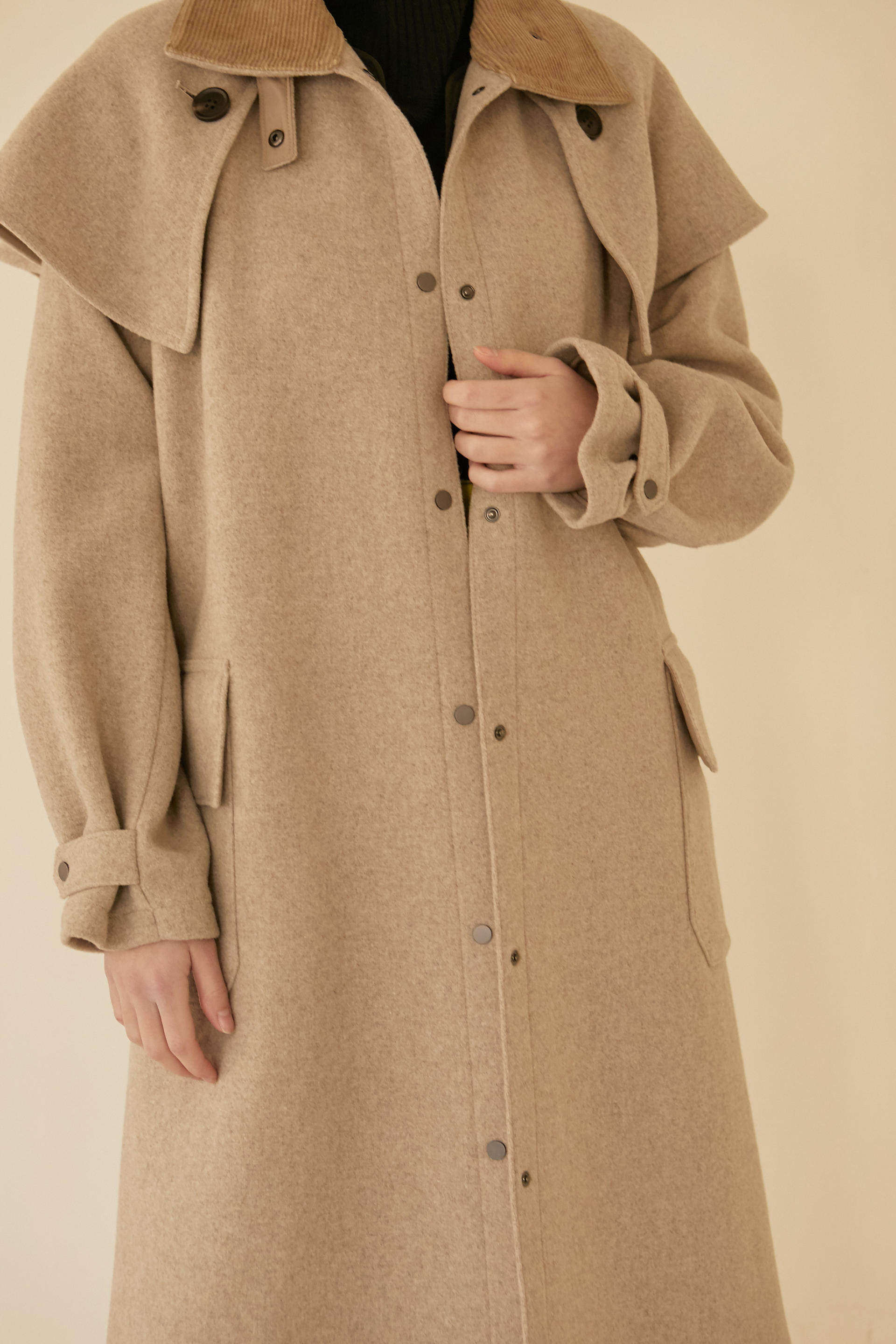 -케이프 디테일이 있는 코트로 앞여밈 돗도와 소매 비조등 캐주얼 요소를 믹스매치한 르베띠르만의 아이덴티티가 있는 아이템 입니다.