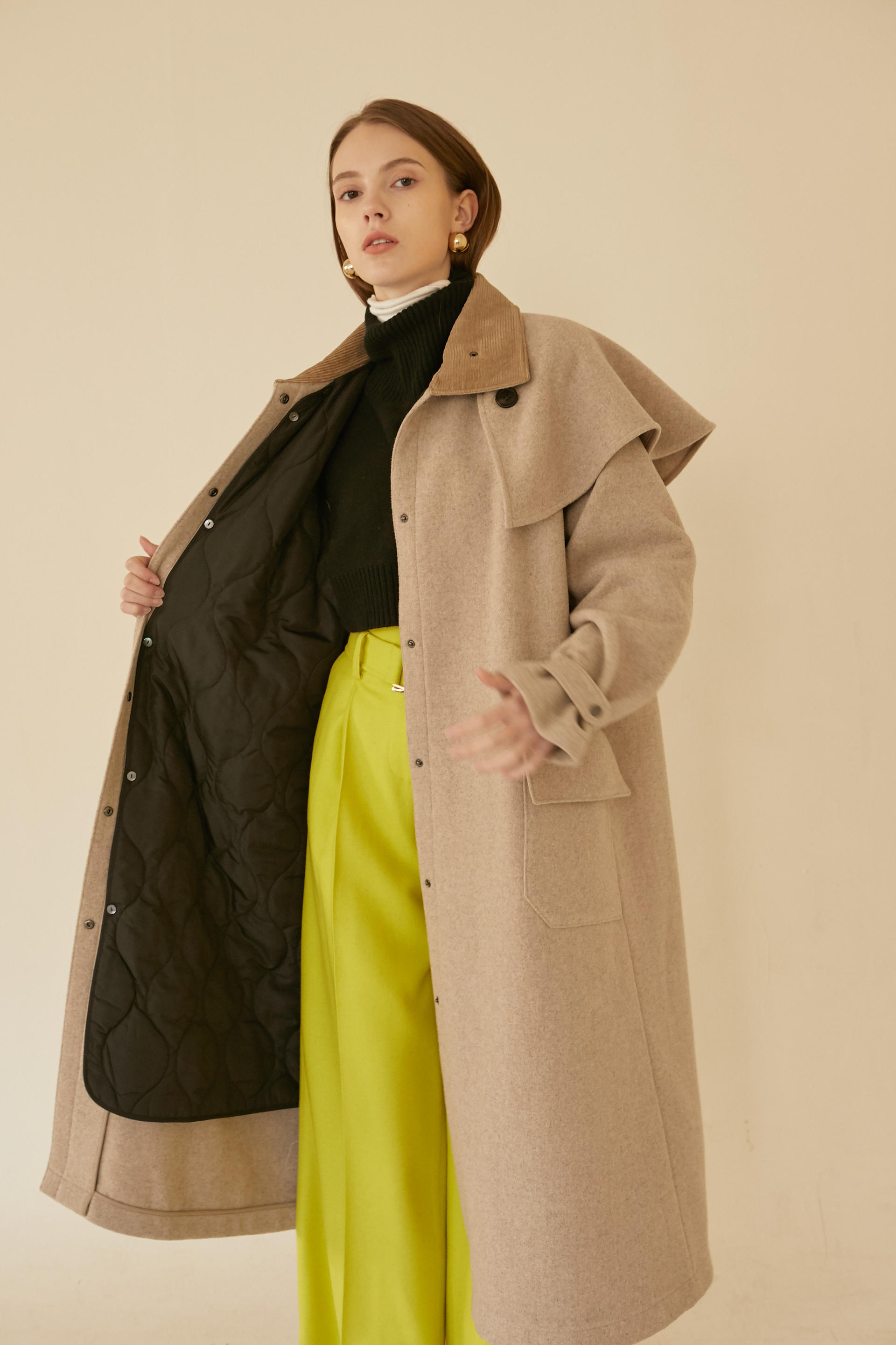 -코트는 안감 없이 전체 배색 해리 작업을 하여 고급스럽고 깔끔하게 봉제마감 하였고 안감 대신 탈부착돼는 퀼팅솜 라이닝으로 보온성과 디자인 요소를 주었습니다.